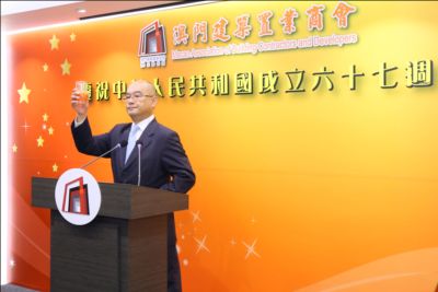 今年是祖國成立六十七周年的大日子,為此,澳門建築置業商會今天與各界聚首一堂舉行慶祝酒會,以表達我們對祖國華誕的歡欣之情;同時,本人謹代表商會對各位的蒞臨和一貫的支持及愛護表示衷心的感謝和熱烈的歡迎。